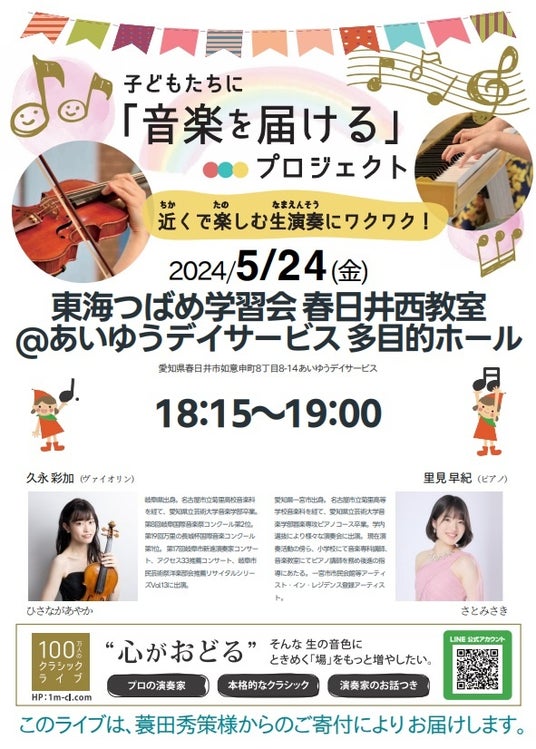 一般財団法人 100万人のクラシックライブ様主催の子ども達に音楽を届けるプロジェクトにより、5月に無料コンサート実施。施設の高齢者・地域の方々等、多数の来場者があり、地域への還元企画にも!