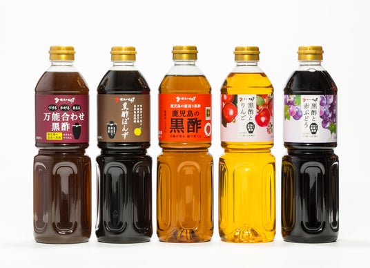 左から、万能合わせ黒酢、黒酢ぽんず、鹿児島の黒酢、黒酢とりんご、黒酢と赤ぶどう