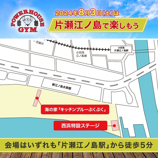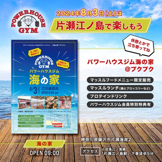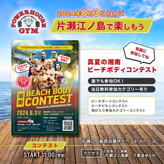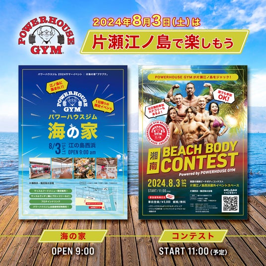 全世界の会員数は120万人以上。今年で創立50周年を迎える「パワーハウスジム」が、8月3日(土)片瀬江ノ島にて1日限りのイベント「パワーハウスジム海の家」と「真夏の湘南ビーチボディコンテスト」を開催。夏の湘南をさらに熱く盛り上げます。