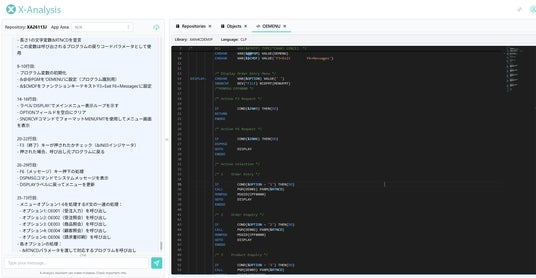 このたび新たに提供される「X-Analysis Assistant」は、OpenAIのGPTやAnthropicのClaudeといった生成AIと、X-Analysisの構造解析リポジトリを連携させたWebブラウザベースの解析支援機能です。RPG、COBOL、CLなどIBM iの代表的言語に対応し、自然言語による質問に対して、アプリケーション全体の文脈を理解した形で回答を行います。