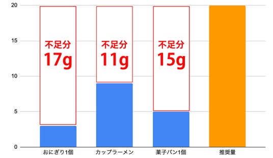「ながら昼食」で食べることの多いおにぎりや菓子パンなどでは、推奨量の半分もたんぱく質が摂取できません。