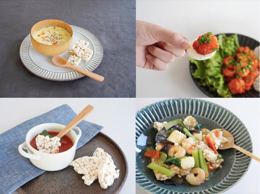 ポンせんはそのまま食べても美味しいですが、お料理やおやつとの相性も抜群です。スープの横にバケット代わりにそえたり、スープに崩して入れればボリュームたっぷりのリゾットに。冷や汁などの冷たいスープや水を注いでもすっきり美味しい。カナッペにすれば大人のおつまみや主食に。中華あんかけに大きく割って入れたらヘルシーな即席中華あんかけに早変わりします。また、ピーナッツバターやチョコレートクリームを塗った上にバナナやブルーベリー、ナッツなどを乗せれば、ちょっと贅沢なデザートや朝食になります。