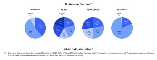 最新のデータでは、日間アクティブユーザー数が7770万人(前年同期比で17%成長)、ユーザーの総エンゲージメント時間が167億時間(同23%成長)という非常に巨大なサービスに成長しています。女性ユーザーが約4割を占め、12歳以下が4割以上集まっていることが特徴的です。