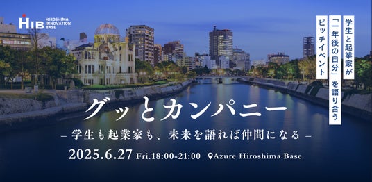 一般社団法人 広島イノベーションベース(代表理事:吉村公孝、所在地:広島県広島市、以下HIB)は、2025年6月27日(金)に、学生と起業家が“1年後の自分”を語り合うピッチイベント「グッとカンパニー ~学生も起業家も、未来を語れば仲間になる~」を開催します。会場はAzure Hiroshima Base(広島市中区河原町)。
