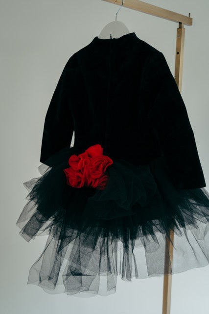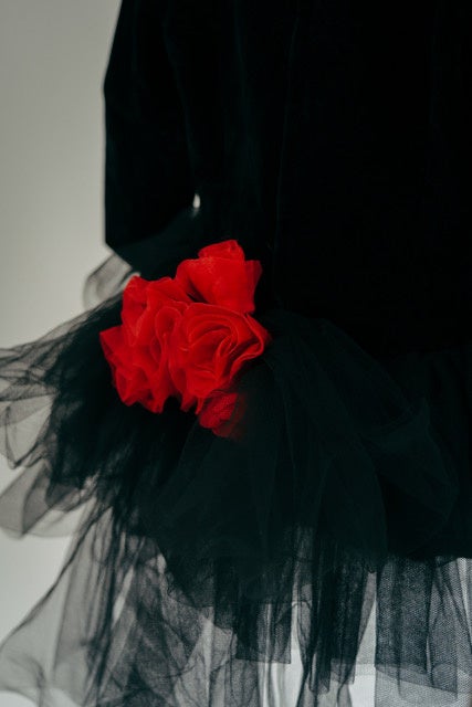 Reflecting on this idea, Hana drew her inspiration from a fond memory of that ONE unforgettable dress from her childhood: a black dress, reminiscent of a ballet tutu, adorned with a large bright red flower corsage at the waist. Whenever there was a special occasion, or even to simply indulge in princess play at home, she would excitedly locate it in her wardrobe, even past the time she had begun outgrowing it.
