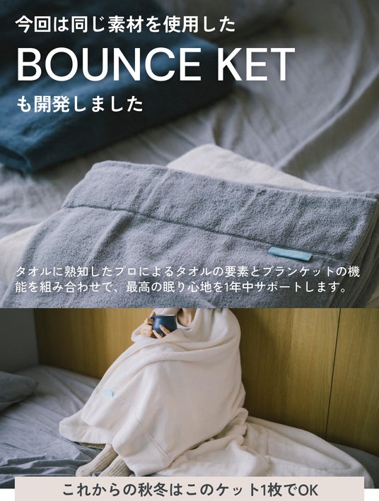 今回はBOUNCE TOWELと同じ素材を使用したタオルケット「BOUNCE KET」も開発しました。