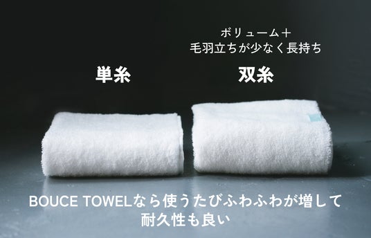 一般的にタオルの劣化が早い理由は、タオルの毛羽が落ちて糸が抜けることでタオルが痩せてしまうからです。単糸で作られているタオルが多い中、BOUNCE TOWELは2本の糸を撚り合わせた双糸を使用することで耐久性をアップしました。また糸に空気を含ませた技術「スーパーゼロ」を施すことで、毛羽落ちを最小限に抑えることも実現。タオル寿命を伸ばし、タオルを何度も買い換える必要がありません。
