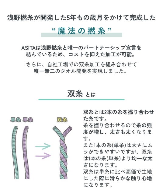 日常生活の中で毎日使用するタオルは、製品としての寿命は平均的に6ヵ月程度しかないと言われています。その理由は、洗濯のたびに毛羽が落ち、それにより弾力や肌触りのよさが落ちてしまうからです。またタオルは天然素材である綿を使用しているため、「ふわふわな肌触りを追求すると製品劣化が早く、耐久性を求めるとゴワゴワする」というトレードオフの関係性がありました。糸という天然繊維が原材料であるタオルはこの2つを両立することが難しく、またその商品の開発も困難とされていました。そこで「ASiTA BOUNCE TOWEL」は、糸に空気を含む特許技術である「スーパーゼロ」の糸と2本の糸を撚り合わせた「双糸」を組み合わせることで、「ふわふわ」と「復活して長持ち」するタオルの開発に成功しました。