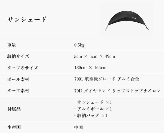 |専用サンシェードUPF50+のUVカット+耐水加工で、強い日差しや小雨もブロック。工具不要のスロット接続式で、3段階の角度調整も可能。