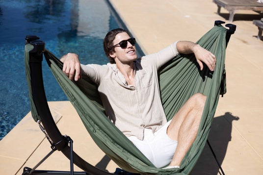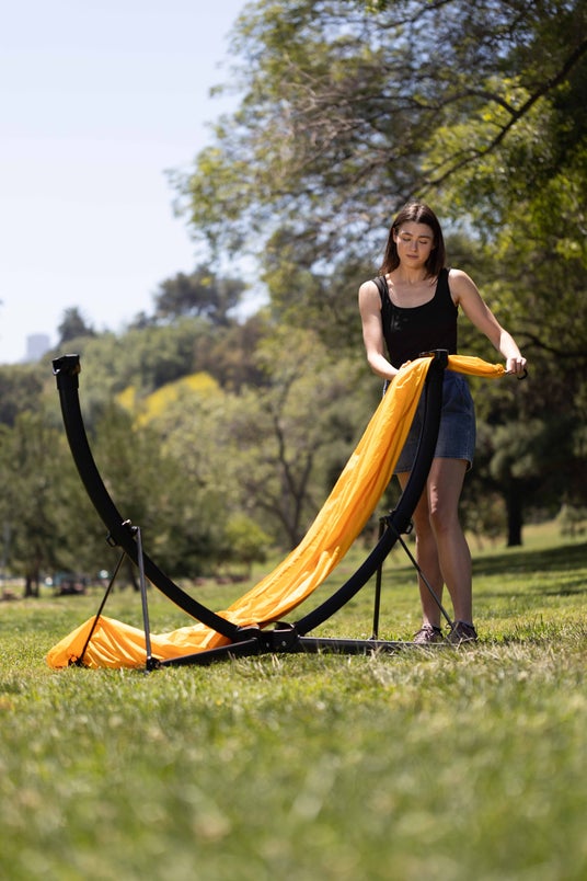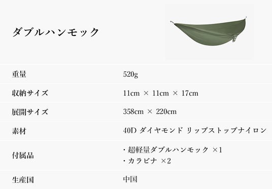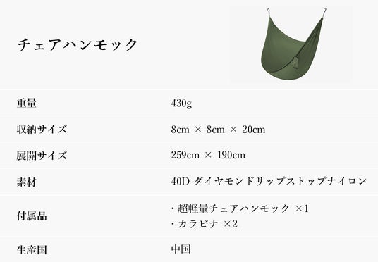 |専用チェアハンモック身長157~193cm・体重50~140kgの幅広いユーザーが「快適」と評価。しなやかな40Dナイロン素材で、包み込まれるような座り心地を実現。