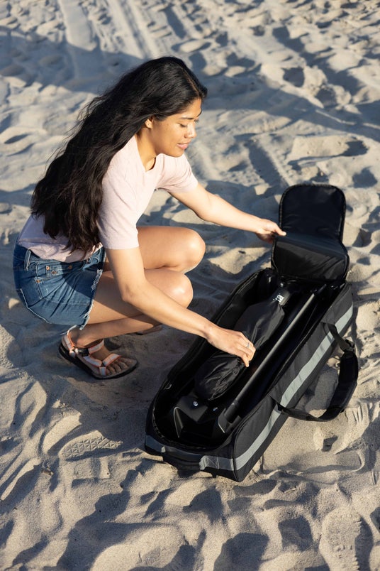 本体はわずか約7.8kgの軽量ボディ。コンパクトに折りたためば、付属のバックパックにすっきり収納でき、背負って移動もスムーズです。