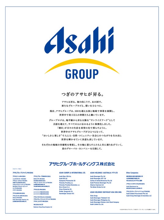 アサヒグループホールディングスは、1889年に日本で創業し、現在はビールを中心とした酒類、飲料、食品で多様なブランドを世界で展開しています。その国と地域は100を超え、世界中で約3万人の仲間たちと働いています。世界中のアサヒグループがひとつとなって、「朝日」のように世界を輝かせていく決意を込めて、この度メッセージ広告を発信するに至りました。