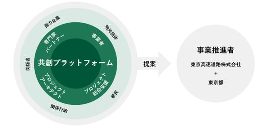 これまでにない新しい公共的空間の在り方を企画・検討するため、事業デザインの企画・実装を提案する仕組みとして「共創プラットフォーム(※)」を組成。計画検討の初期段階から、事業者だけでなく、多領域の専門家を交えながら、新たな価値について議論を行うプラットフォームとなるような、多くの人が様々な形で関われる仕組みを元にプロジェクトを推進します。