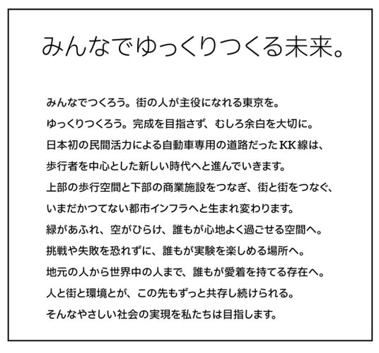 60年以上の長い歴史を積み重ねてきたKK線の既存施設を再生する本プロジェクトは、様々な人と関わり、会話を重ね、解像度の高い計画・デザイン・実行というプロセスを踏みながら丁寧に進めていくべきであると考えます。そして、供用開始後も完成形はなく様々な人の手垢をつけてつくっていくことにより、愛着をもって進化し続ける、そんなまちづくりの理想を「ゆっくりつくる」という表現に込めています。