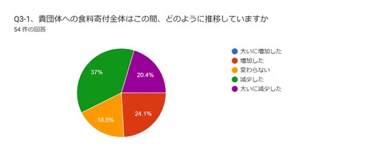 1.この間の食料寄付量の推移についての回答は、「減少した」が37%、「大いに減少した」が20.4%で、合計では57.4%となっている。およそ6割の団体で食品寄付が減少している(Q3-1参照)