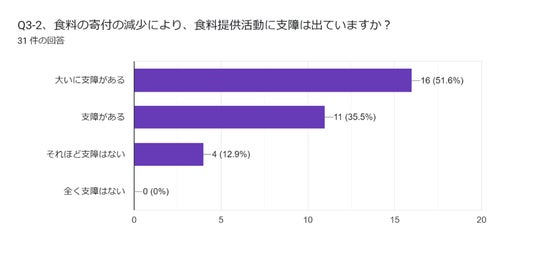 2.「減少した」「大いに減少した」のいずれかを回答した団体(31団体)に、食料提供活動への支障を質問したところ、「支障がある」が35.5%、「大いに支障がある」が51.6%という結果となった(Q3-2参照)