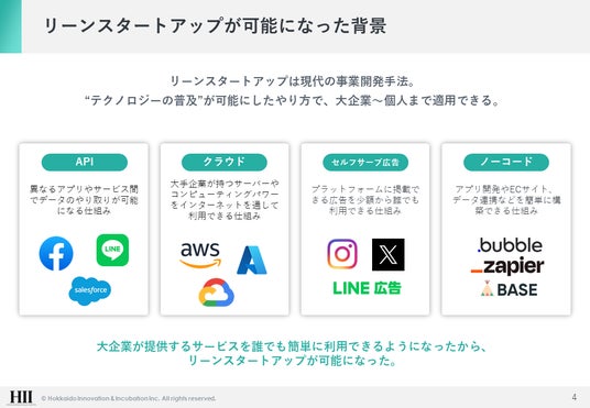リーンスタートアップが可能になった背景には、近年のテクノロジーの発展とそれを誰でも自由に使える環境の整備が要因と考えます。