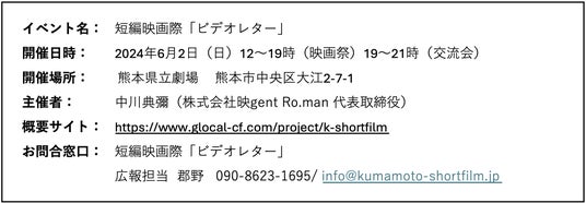 株式会社映gent Ro.man (本社:熊本市中央区春竹町 代表 中川典彌)は、熊本市中央区大 江の熊本県立劇場にて、2024年6月2日(日)撮影地、監督、演者、スタッフ等すべて熊本に こだわった短編映画際「ビデオレター」を初開催します。映画祭当日は主催者の中川と18歳 の高校生監督による短編映画2本を上映するほか、トークショーや交流会、フードブースの出店等も計画。映像で熊本を盛り上げるきっかけづくりの1日となるよう、作品の制作、クラウドファンディング、告知等の準備を進めています。