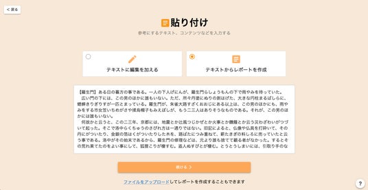 授業ファイルやテキストからレポート作成することが可能になりました。授業ファイルや授業のテキストをアップロードすることで、その内容からレポートを作成することができます。
