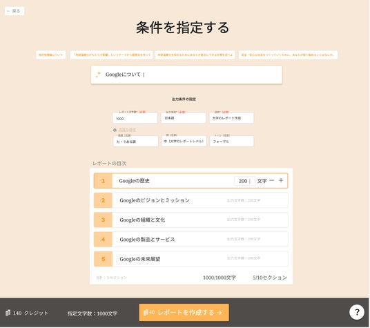こちらのページで、レポートの条件を指定することが可能です。(例:文字数、レポートのテーマ、目次、目次毎の文字数など...)