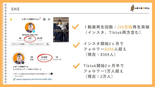 インスタ開始2ヶ月でフォロワー6000人(現在:8492人)、Tiktok開始2ヶ月半でフォロワー1万人(現在:2万人)超えを達成しております。