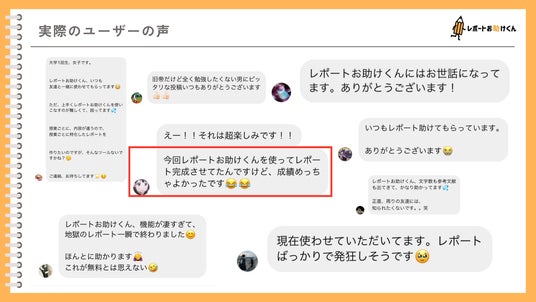 現役の国立大学生が設立した株式会社VIVRE CARD(本社所在地:神戸市、代表取締役社長:中原 龍士朗)は、大学のレポート作成を効率化するためのサービス『レポートお助けくん』のログインユーザー数が大台の1万人を突破いたしました。『レポートお助けくん』はリリース(2023年7月)わずか8ヶ月で、累計ユーザー数が5万人を超えるサービスに成長しており、現在は約7万人の大学生に、ご利用いただいております。