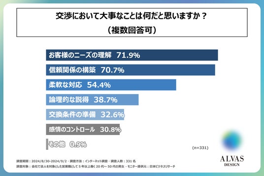 最後に、「交渉において大事なことは何だと思うか」を問う設問の回答では、1位が「お客様のニーズの理解」で71.9%、2位が「信頼関係の構築」で70.7%、3位が「柔軟な対応」で54.4%となりました。この結果から、交渉においてはお客様のニーズを理解することが大事だと考えている方が多いとわかりました。