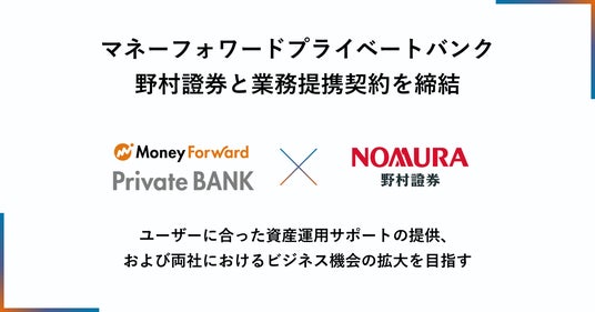 マネーフォワードプライベートバンク株式会社は、野村證券株式会社と業務提携契約を締結しました。本契約締結により、当社ファミリーオフィスのユーザーは、野村證券のウェルス・マネジメントが提供する、豊富な金融商品・サービスをご利用いただくことが可能となります。当社は野村證券とともに、超富裕層へのカスタマイズ性の高いサポートの実現を目指します。