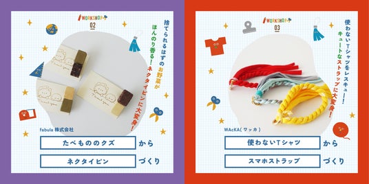 「海洋プラからアクセサリー」「規格外野菜からふりかけ」「ペットボトルキャップからキーホルダー」「役目を終えたカーテンからコインケース」など、4日間で計11種類のワークショップが集結。自分の手で作った作品は、きっとお気に入りとなって大切に使ってくれるはず。