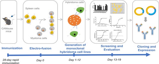 完全ヒト抗体医薬品の開発支援サービス完全ヒト抗体マウスは、完全ヒト抗体開発の中核をなすツール動物であり、当社が構築した完全ヒト抗体開発プラットフォーム(CAMouse(R))は、マウスのB細胞の正常な発達を保証し、完全ヒトIgGを直接発現させる現在世界で唯一の完全ヒト抗体マウスを使用しています。
