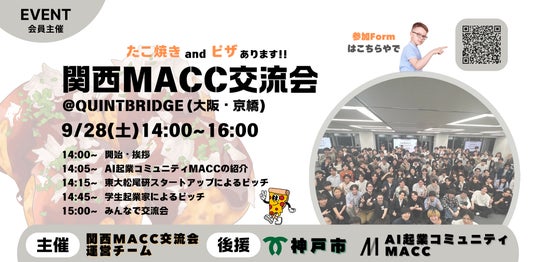 関西MACC交流会運営チームは、2024年9月28日(土)に大阪市京橋のQUINTBRIDGEにて、AIスタートアップピッチイベントを開催いたします。本イベントは、東京大学松尾研が運営するAI起業コミュニティ「MACC」の関西交流会として開催され、AI関連の学生起業家やスタートアップ支援関係者を対象としています。