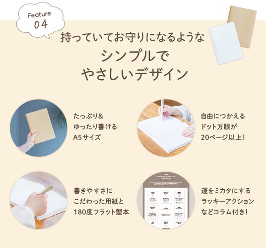 - 持っていいてお守りになるようなシンプルでやさしいデザイン*時間や人生を”マネジメント”する手帳というよりは、自分をサポートする頼りになる相棒。そんな存在になるように設計しています。