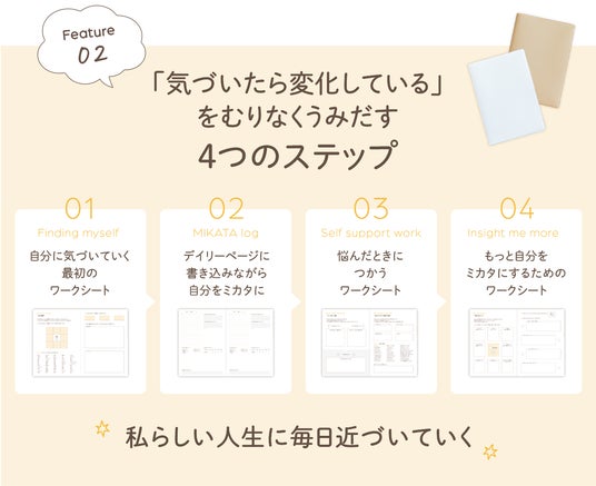 「誰もが自分自身を一番の味方にして、自分らしく生きる毎日を送れるように」という代表の想いからスタートしたこのプロジェクト。3ヶ月間毎日使用するうちに「気づくと自分がミカタになっている」。そのためのセルフコーチングワークを、手帳形式で簡単に取り組めるように制作されています。