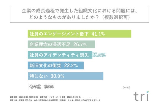 続いて「企業の成長過程で発生した組織文化における問題には、どのようなものがあったか」を問う設問の回答では、1位が「社員のエンゲージメント低下」で41.1%、2位が「特にない」で30.0%という結果になりました。企業が成長するためには社員数を増やしていく必要があり、それに伴い経営者が直接接点を持てる時間が少なくなり、価値観の異なる様々なメンバーが増えるからか「社員のエンゲージメント低下」が問題になる、という事実が浮き彫りになりました。ただ、一方3割の企業では組織文化の面では、特に問題が発生していないとわかりました。