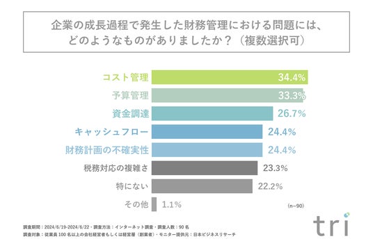 また、「企業の成長過程で発生した財務管理における問題には、どのようなものがあったか」を尋ねる設問の回答では、1位が「コスト管理」で34.4%、2位「予算管理」で33.3%という結果になりました。昨今、円安も相まって物価高が続いていますが、この結果から財務管理における一番の問題は「コスト管理」であると考えられていることがわかりました。