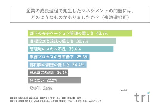 最後に「企業の成長過程で発生した人材管理の問題には、どのようなものがあったか」を尋ねる設問の回答では、前項とも関連する部分があり、1位が「人材育成」で44.4%、2位が「優秀な人材の確保」で43.3%、3位が「リーダー育成」で42.2%となりました。この結果から、人材管理面でも特に管理職・リーダー層の育成や採用が大きな問題となっている事実が浮き彫りになりました。