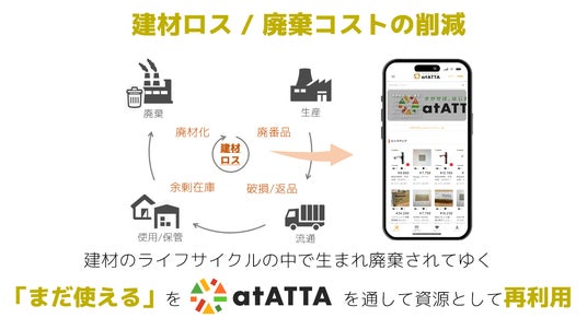 SMB建材株式会社(本社:東京都港区、代表取締役:黒川 朝晴)は、建材のライフサイクルの中で「まだ使える」にもかかわらず廃棄処分されてしまう商品を再流通させるためのフリマサイト『atATTA』(アットアッタ)の提供を開始いたしました。『atATTA』は、企業同士や企業と個人が自由に商品を売買することで、建材ロスと廃棄コストの削減を実現し、持続可能な未来の創造に貢献するサービスです。