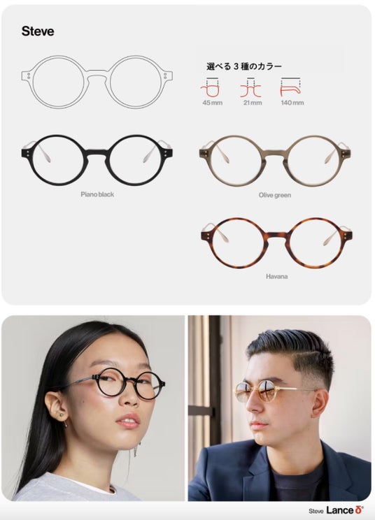 Steve:「スティーブ」はイタリアのMazzuchelli社製のバイオ高密度アセテートと、軽量でありながら頑丈なチタニウムを巧みに組み合わせることにより、軽さと耐久性と快適性を兼ね備えた驚異的な製品に仕上がりました。