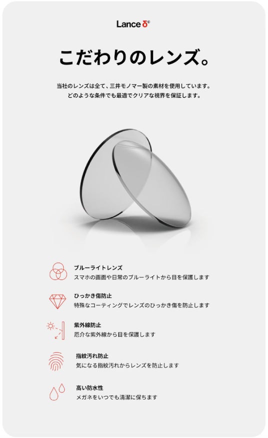 Lanceδのレンズは三井モノマー製のレンズを使用しています。付属のレンズはブルーライトフィルターのついたクリアレンズですが、サングラスのレンズやカラー付きの特殊レンズなどに変更可能です。