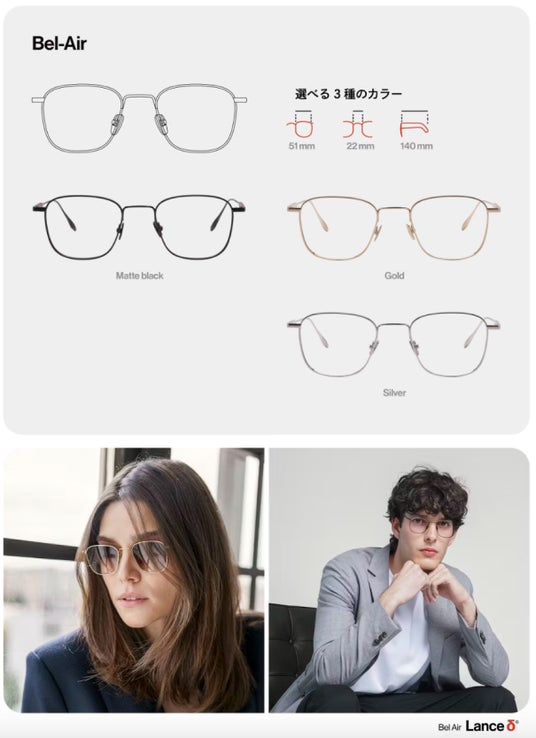 Bel-Air:「ベルエアー」は、フルチタン構造と革新的な形状記憶合金ブリッジをシームレスに統合した先進的なデザインが特徴です。チタン製ノーズパッドも装備されており、スタイリッシュで洗練されています。