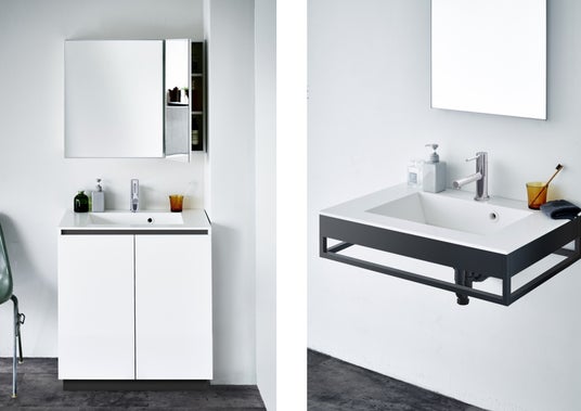 そのメインであるボウル一体型天板は、まったりとした素材感・質感のある注型製法で製造し手加工でバフする人工大理石を使いました。デザインは深型のスクエア形状とし、かつ機能的にする為にどこにでもある既製品では妥協せず、あえてオリジナルの形状に拘りました。■スタンディングタイプとフローティングタイプの2種の仕様スタンデイングタイプは、表面に艶消しの細かいエンボス調の白いオレフィンシートをメインの表面材に使用し、手掛かりと幅木部分に黒いオレフィンシートをデザインアクセントとしています。排水バルブはプッシュ式で水が溜められる様になっており、オーバーフローで溜まった水が一定量になれば排水に流れる仕組みです。特注の排水トラップは、黒色の樹脂製で意匠性にも拘り、P(壁)・S(床)兼用となります。MonochroZ(モノクロZ)は、白・黒が適度に程よく混ざり合ったモノクロームな逸品です。フローティングタイプは、足元すっきりの軽やかなデザインが特長です。フレームにはタオルや小物を掛けることが可能で、機能と意匠を一体化した洗面台です。商品名:モノクロ Z