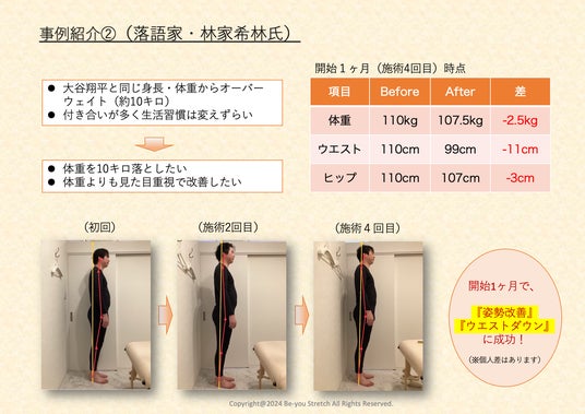 金谷有希子氏と同様、姿勢改善によるウエストダウンは11cm、わずか数回の施術で見た目にも分かる大きく変化が現れました。体重は2.5キロ減となっており、順調なペースで進んでいます。