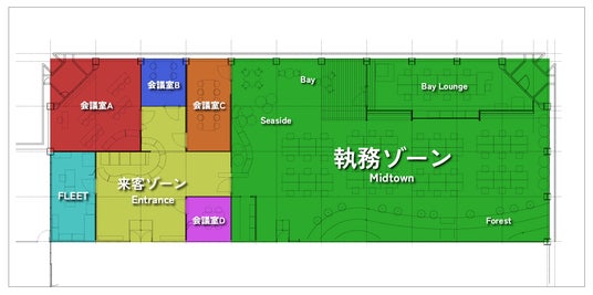 執務ゾーンのメインエリアは"ジャングルから街を抜けて大海原へ旅立つ様子"を表現しています。