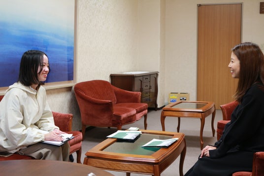 大学生の府民ライター(写真左)が、いのちの響き合いを取材したいと大阪フィルハーモニー交響楽団に取材依頼。奏者へのインタビューシーン。