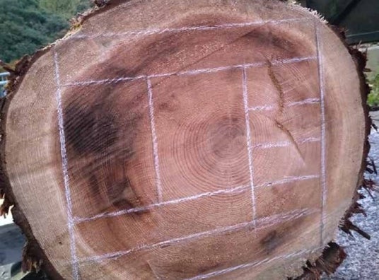 松葉善製材所にて直径50 センチ以上ある南河内の杉の丸太を製材。座面と脚の部分を切り出していく。