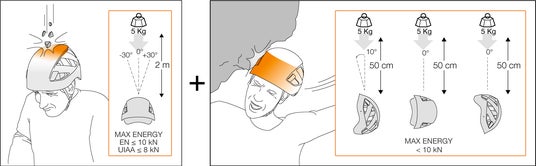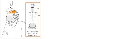 頭全体を広くカバーペツルは独自の保護基準「TOP AND SIDE PROTECTION」を設け、ヘルメットの上部に受ける衝撃だけでなく、側部、前部、後部にも一定レベルの保護性能を保証しています。