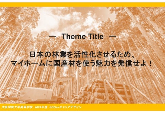 今回の探究学習において、当協会は高校生に向けて「日本の林業を活性化させるため、マイホームに国産材を使う魅力を発信せよ!」というテーマを提供いたしました。このテーマを探究することは、日本の林業の持続可能性、ひいては地球環境の持続可能性を考えることに繋がる重要なテーマです。