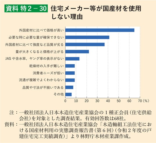 一般社団法人日本木造住宅産業協会によるアンケート調査によれば、住宅メーカー等が木造軸組住宅において国産材を利用しない主な理由としては、「外国産材に比べて価格が高い」、「必要な時に必要な量が確保できない」などが挙げられています(林野庁令和3年度 森林・林業白書(令和4年5月31日公表)資料 特2-30)。そのため、これまで製材工場等の大規模化・集約化や流通の効率化に取り組み、国産材の利用割合は徐々に上昇してきているが、引き続き、これらに取り組む必要があるとされています。