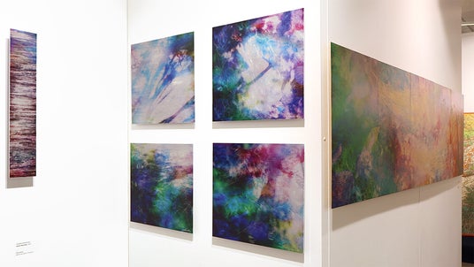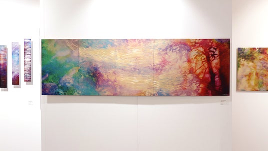 作品が展示されたブース内の様子。200×60cmの作品《夢想》を中心に大小9点の作品が並ぶ。