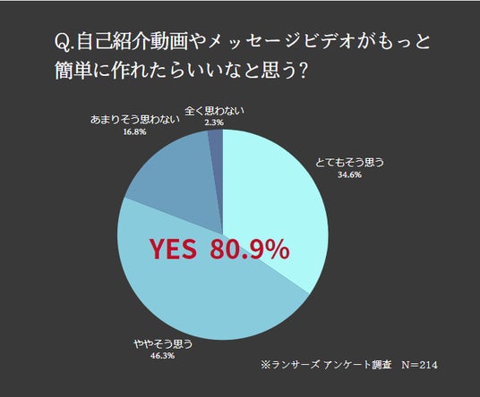 自己紹介動画やメッセージ動画がカンタンに作れたらいいなと思う。80%以上。(ランサーズアンケート調査 2022年1月23日実施,N=216)